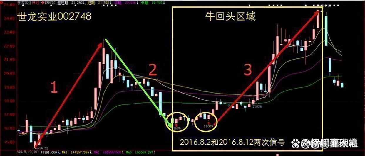 那么在2和3之间就出现了一个牛回头的机会。就是图中,两个黄色圆圈发出信号的地方,这就是牛回头。